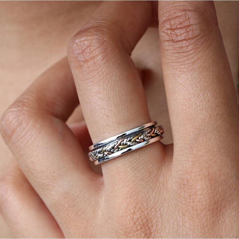 • ❁ A RING FOR EVERYONE - Adorned by a braided three-tone spinner band that sits on the simple sterling silver base ring. The ring is suitable for all genders and tastes thanks to its simple design.