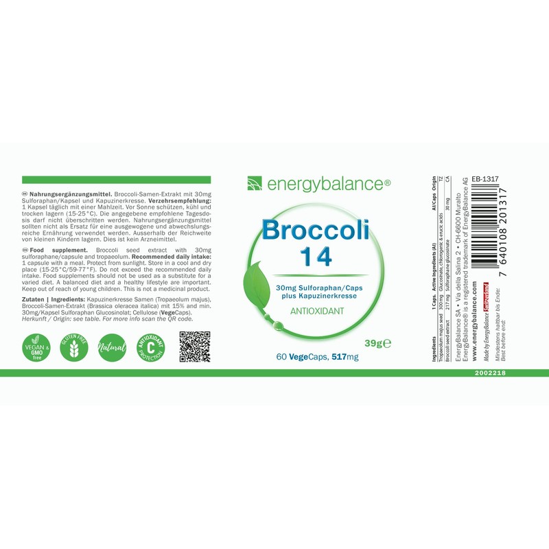 EnergyBalance broccoli extract contains a standardized concentration of sulforaphane glucosinolate extract from broccoli seeds. Sulforaphane glucosinolate is metabolized by the body into sulforaphane (isothiocyanate), which is a highly active antioxidant. Extensive studies proved that sulforaphane enhances the activity of Phase 2 detoxifying enzymes and is a protector of DNA.
