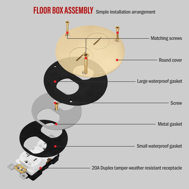 - Outlet installations in floors require special electrical boxes, receptacles, adapters, and covers due to their potential exposure to water and foot traffic. Be sure to use the right parts specific to your installation