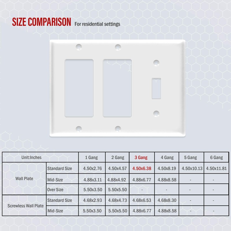 - Easy replacement of any wall plate of the same configuration. Dimensions: 4. 50" height x 6. 38" length