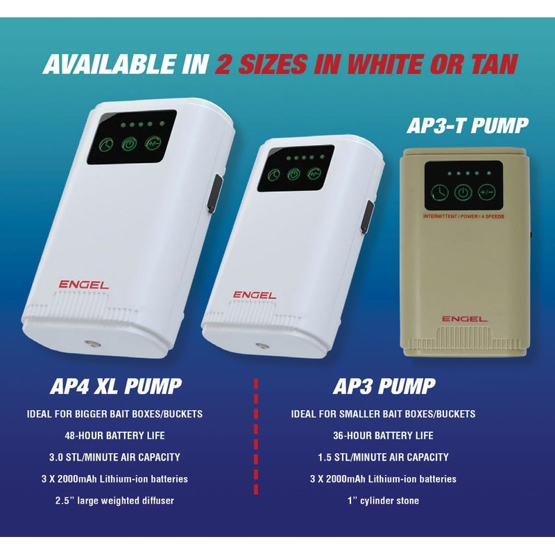 - ENJOY THE QUIET: We are proud to have the quietest bait air pump on the market. When tested against other leading brands, the Engel air bubbler is by far the quietest.