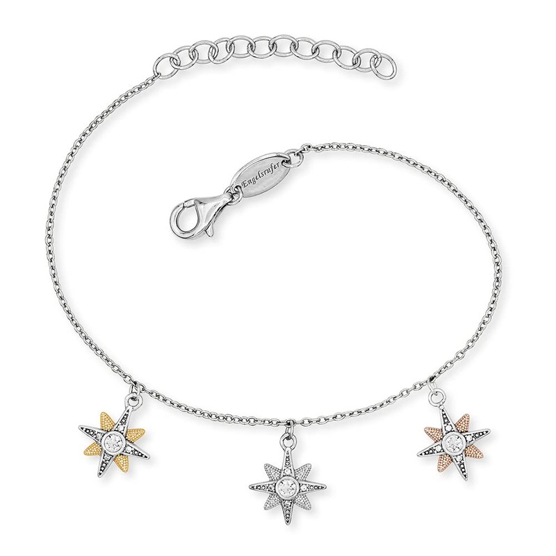 Engelsrufer Women's Tricolour Sterling Silver Bracelet with Three Star Pendants in Silver Gold Rose Gold - Set with 15 Zirconia Stones - Lobster Clasp - Adjustable in Three Lengths, Sterling Silver,
