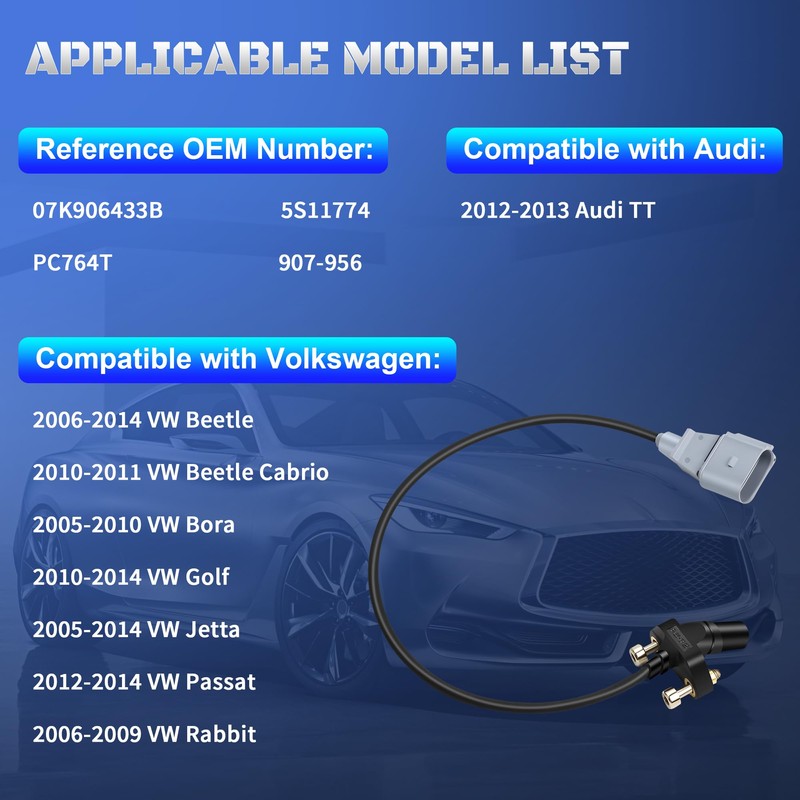 • [Reference OEM Number]: 07K906433B, 5S11774, PC764T, 907-956, Please verify your vehicle's year/make/model along with the original sensor's part number and physical specifications (mounting points/connector type) to ensure perfect fitment