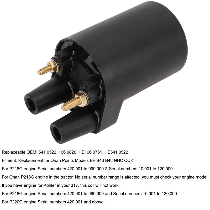 1、Part Number: According to the original factory specifications, ignition coil kit replacing OEM are 541 0522, 166 0820, HE166 0761, HE541 0522. 2、Applicable Model: Engine ignition coil kit, replacement for Onan Points Models BF B43 B48 NHC CCK, you must check your engine model. 3、High Performance: Ignition coils are electrical parts used in vehicles to generate high voltage sparks to ignite fuel and start the engine. 4、Good Replacement: Engineered to strict OE specifications, our ignition coils look and function the same or better than the original ignition coils. 5、Premium Material: Ignition coils are made of quality ABS and alloy materials for durability and reliability in extreme conditions.