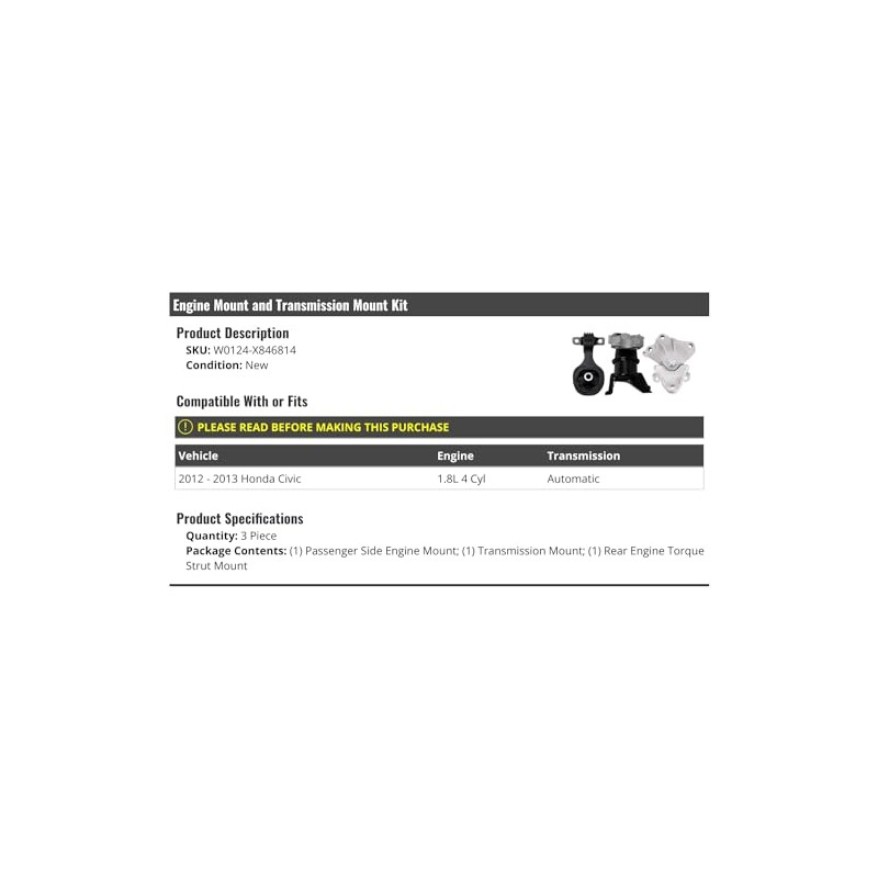 Engine Mount and Transmission Mount Kit - 3 Piece - Compatible with 2012-2013 Honda Civic 1.8L 4-Cylinder Automatic