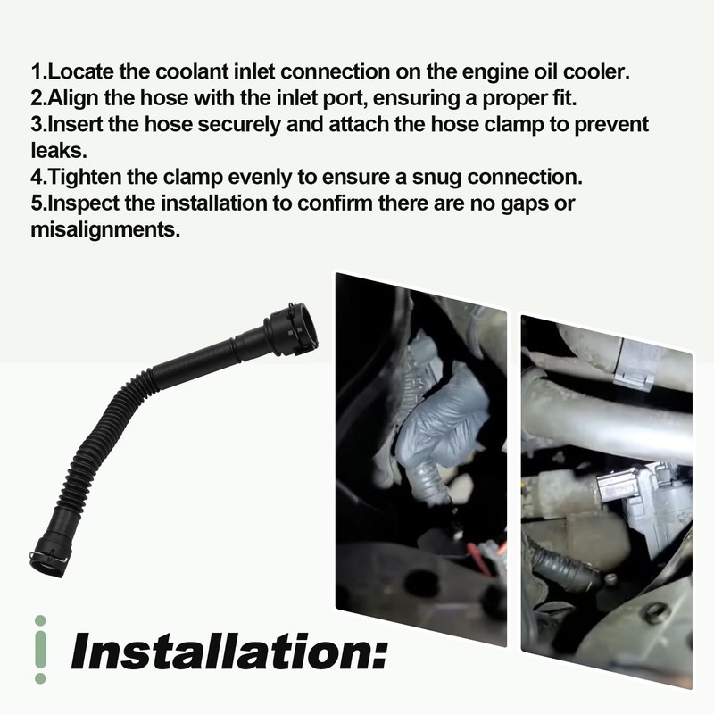 - Function: The engine oil cooler coolant inlet hose helps transfer coolant to the oil cooler to regulate engine oil temperature, ensuring optimal engine performance