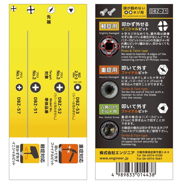 Engineer DBZ-21 Nejisaurus Bazooka Set, Removes Damaged Phillips Screws and Hex Hole Bolts, Set of 4 Bits