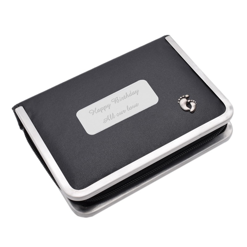 English Pewter Baby Feet Design Black Leatherette Manicure Set with Personalised Engraved Message