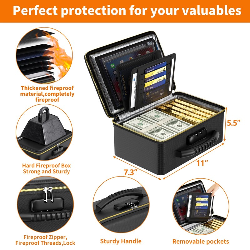 - Spacious & Organized Storage: Fireproof Storage Box - With an external size of 11 x 7.3 x 5.5 inches (Internal dimensions: 10.5 x 7 x 4.5 inches) and a removable multi-layer design, this fireproof box meets all your storage needs. It includes 5 small mesh bags, 2 large mesh bags, 5 card slots, and a main compartment, perfect for organizing cash, golds, jewelry, passports, A5 documents, credit cards ,u disks other valuables