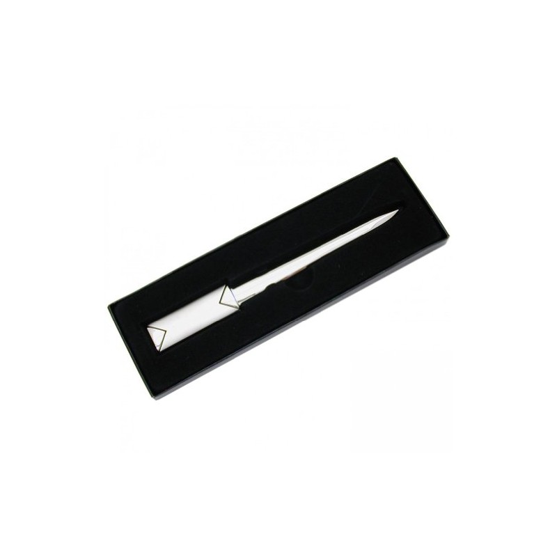 The letter opener is lined in a black presentation box with a black velour.