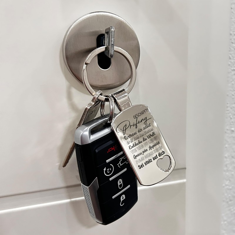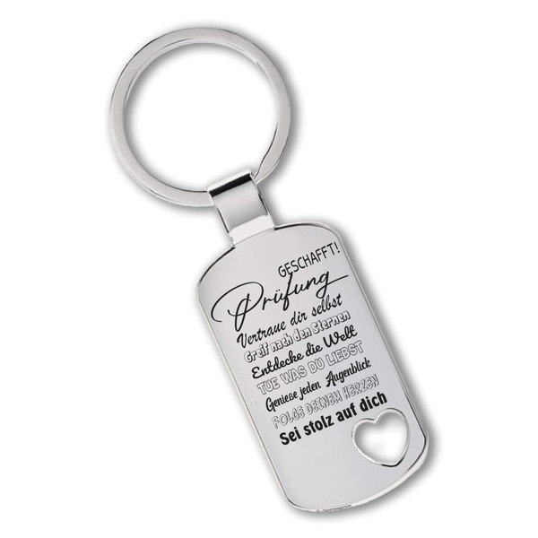 Engraving Stainless Steel Keyring with Cut-Out Heart | Prüfung geschafft! | Key Ring for Exam Completion | Car Pendant with Key Ring on Request with Back Engraving, Cut out heart