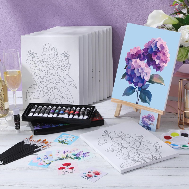 • Pre Printed Canvases: a total of 12 pre printed canvas in 12 different well designed patterns; Comes with 12 reference color matching cards corresponding to the pattern; Pre printed with simple and clear plant patterns allow people with no painting experience to let their imagination run wild between the lines