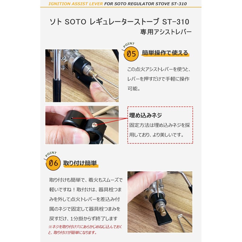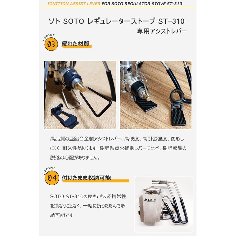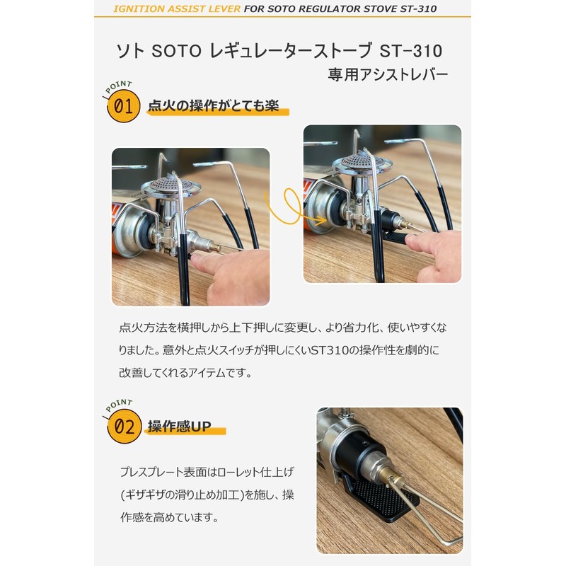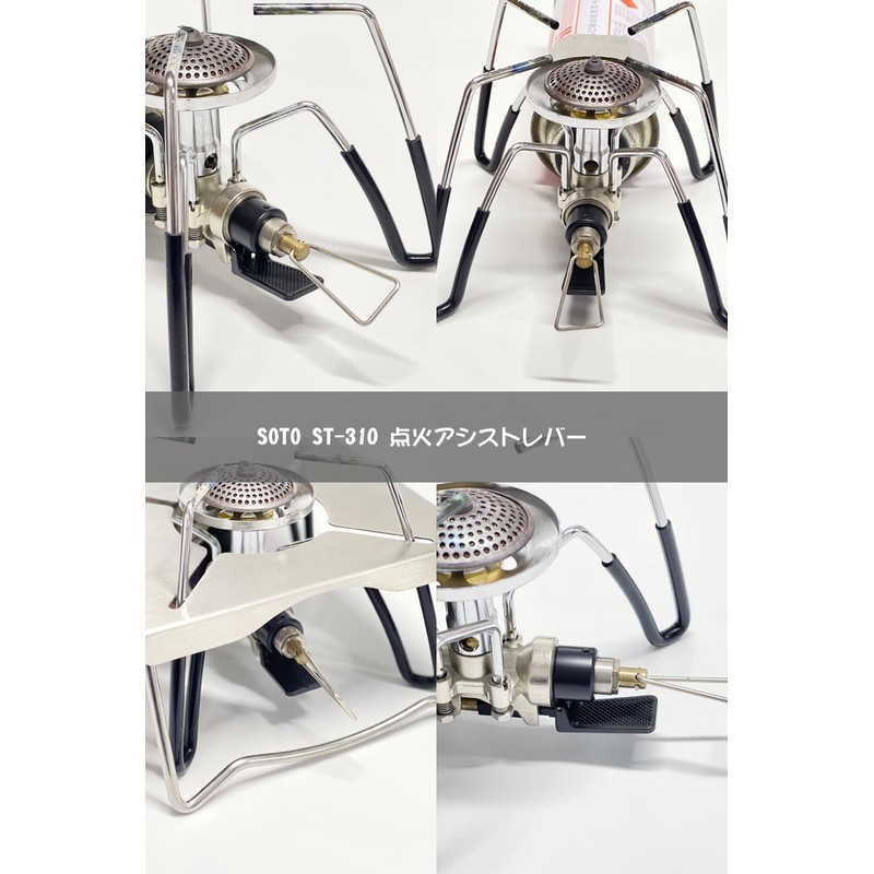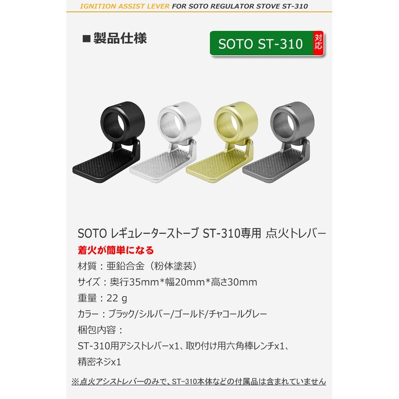 - (SOTO ST310 Dedicated Assist Lever) This product is an ignition lever that attaches to the SOTO regulator stove. This item will dramatically improve the operability of the ST310 which makes the ignition switch difficult to push out