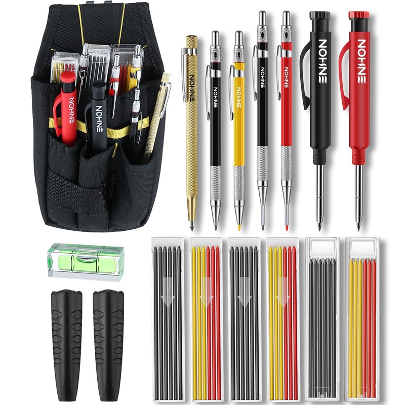 - 17 Pcs Woodworking Pencil Set: Get everything you need in one comprehensive package, including 2 x 2.8 mm carpenter pencils, 2 x caps, 2 x 2 mm pencils, 2 x deep hole 2 mm pencils, 6 x replacement refills, 1 x carbide scribe tool, 1 x bubble level, and 1 x handy storage pouch