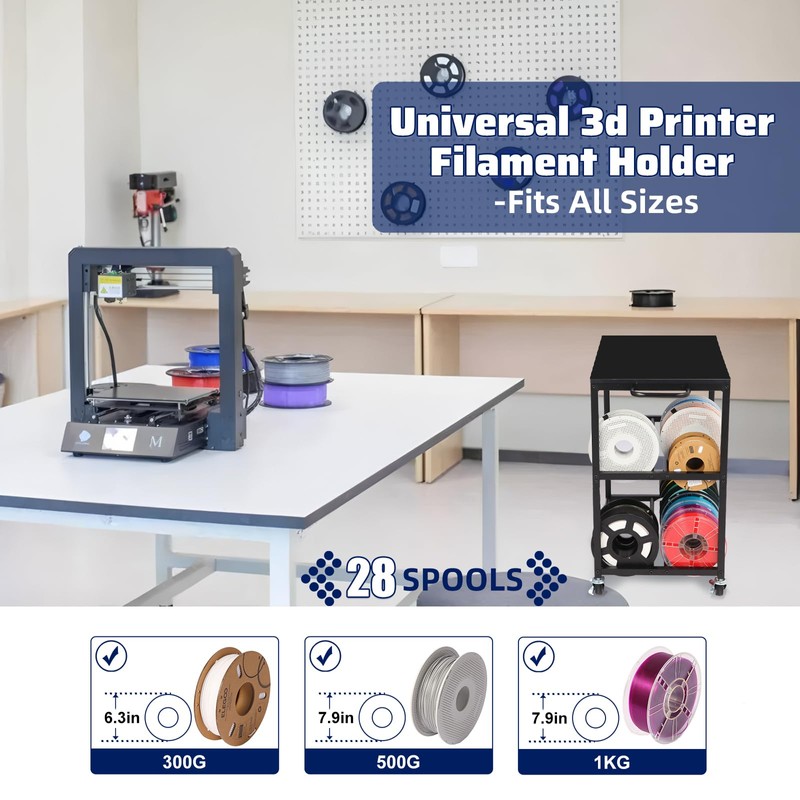 Dual-tier filament rack holds 28+ standard spools (1kg ABS/PLA/TPU/Nylon compatible)