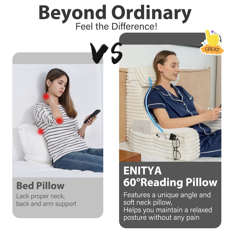 - [Luxurious 2-Layer Composite Design]: ENITYA reading pillow is the first to incorporate a multi-layer foam composite design. Each layer is carefully selected, with high-density foam for solid support and high-resilience foam for a soft, cushioning embrace—delivering an unparalleled comfort experience.