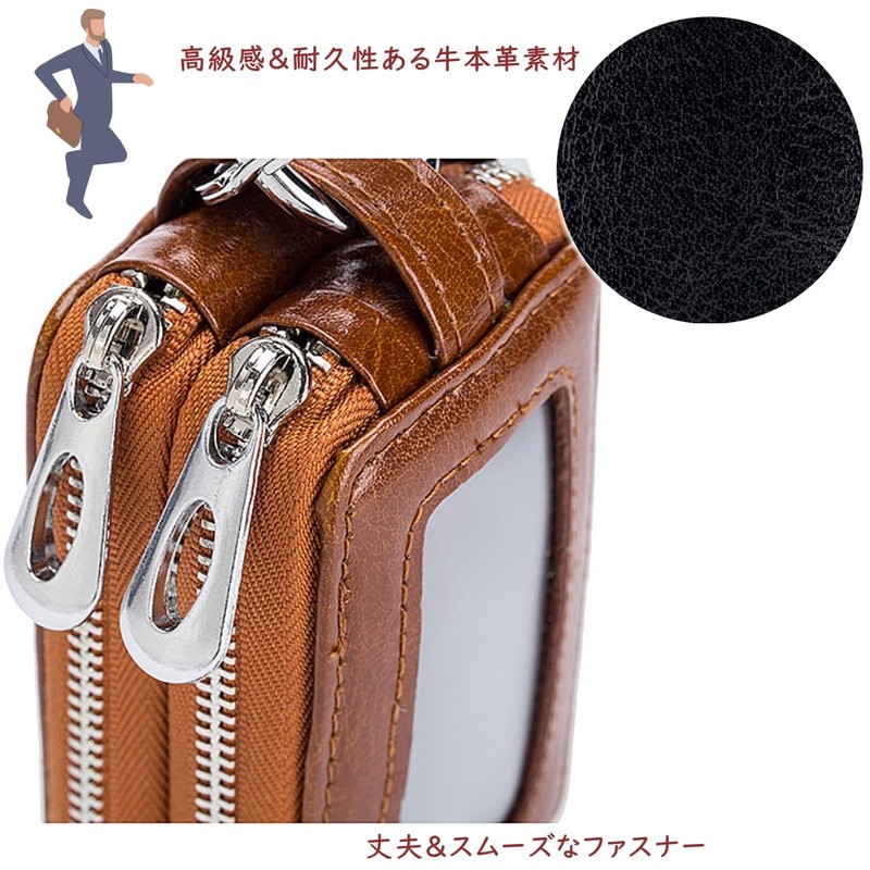 ENJHIKE Genuine Leather Key Case, Men's, Women's, Car Key Case, Double Layer, Cowhide Leather, Double Zipper, Compatible with Smart Keys, Large Capacity, Compact, Clear Window, Gift, Gift, Carabiner