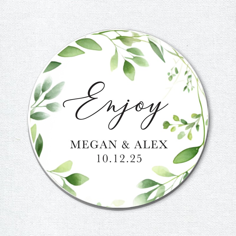 Enjoy favor stickers for weddings, baby or bridal showers, Round eucalyptus thank you labels for welcome bags or cookie boxes, Port of Reverie Company