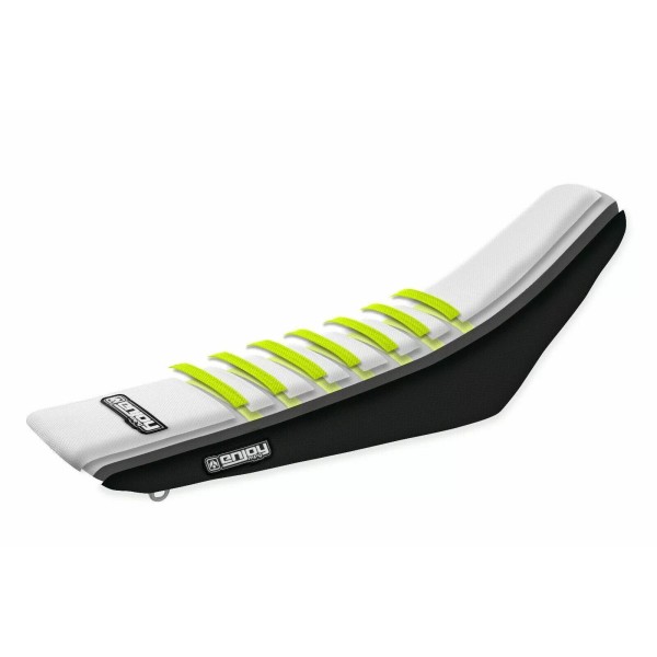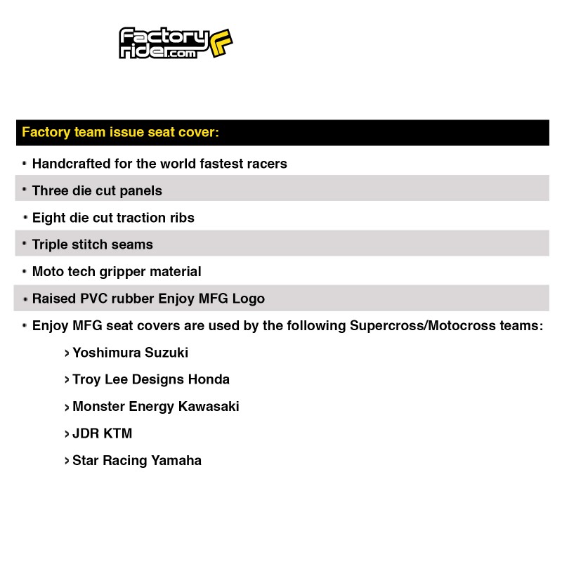 Enjoy Mfg seat cover produced in the color way you want. ***** In the Notes of your Payment Tell us this Information SIDE COLOR: TOP COLOR: RIB COLOR: The colors available are pictured : Black / Grey / Silver / White / Bright White / Neon Yellow / Bright Yellow / Yellow / Gold Yellow Orange / Bright Red / Red / Maroon / Pink / Flo Green / Green / Mint / Light Blue / TM Blue Blue / KTM Blue / Purple Revamp your ride with this premium dirt bike seat cover, designed to enhance both style and performance. Crafted with a unique grippy texture, this seat cover ensures maximum traction and stability, keeping you secure during your most intense rides. Perfect for motocross enthusiasts and casual riders alike, this new seat cover offers durability and comfort, tailored to withstand rugged terrains and extreme conditions. Upgrade your dirt bike today and feel the difference with every ride! Enjoy's gripper tec material is made with a high-quality cloth and fused with a special PVC top texture that is waterproof and wear-resistant. The special texture provides a great amount of traction and holds the rider in place, especially over rough terrain. Designed with HARDCORE riders in mind. Proudly crafted in the USA, our seats feature high-quality stitching and excellent craftsmanship. It is specially designed as a replacement for your old, worn, slippery seat. Installation is easy since this cover was cut and assembled specifically for your seat. - Staple gun required - |
