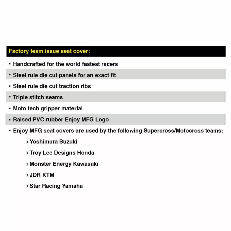 Enjoy Mfg Ribbed Gripper Seat cover Enjoy Mfg seat covers are an awesome up grade for your Quad Very easy to install. Each seat cover is made to fit perfectly. Enjoy Mfg uses the finest purpose built material for off road riding and racing. Fit: Arctic Cat DVX 400 Years: 2004,2005,2006,2007,2008 Enjoy Mfg gripper material Die Cut for an exact fit Double Stitched Seams Raised Gripper traction ribs Raised Pvc rubber Enjoy Mfg logos