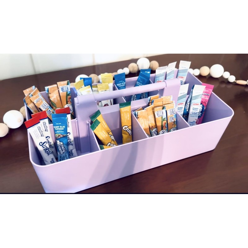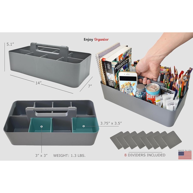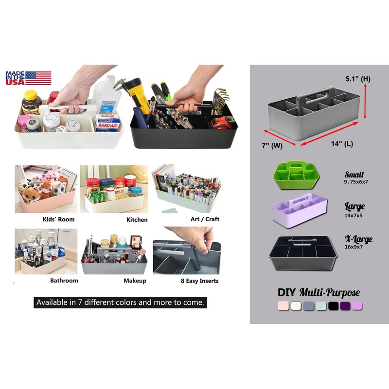 2 PACK - DIY Storage: Experience the ultimate organization with our generously sized 8-compartment storage solution. Featuring removable dividers, this versatile caddy is perfect for acrylic paints, glitter, yarn, ribbons, paper, markers, crayons, albums, fabric, and much more. It offers multiple storage options, including scrapbook supplies, photo storage, card making supplies, dies, templates, punches, stamps, and more. Ideal for home use for kids' arts and crafts, in the classroom, or art studio, its sturdy construction ensures it's perfect for a multitude of organizational needs. PORTABLE: Equipped with an easy-carry round smooth handle, this caddy makes transporting goods from shelf to cabinet or desktop a breeze. Just grab and go! The open tops and divided compartments make it easy to see what’s inside and quickly grab what you need. Use these convenient storage caddies to keep office desk items organized, children's crafting items tidy, and school supplies in check. Perfect for both home and commercial workspaces. FUNCTIONAL & VERSATILE: This caddy is incredibly versatile, able to store a multitude of household items like cleaning products, medical supplies, cosmetics, toys, lotions, laundry needs, office or school supplies, and more. The options are endless. It’s perfect for college dorm rooms, apartments, condos, RVs, boats, cabins, and campers. Use this multi-purpose caddy anywhere you need to add storage and get organized. Ideal for both home and professional organizers. SIZE: Each caddy measures 14" x 7" x 5.1" high, making it a spacious solution for various storage needs. The caddy is easy to clean with water and soap, ensuring hassle-free maintenance. Available in a 2 PACK - Enjoy Organizer. STRONG AND DURABLE: Meeting all safety standards, our caddy is designed to provide the utmost quality and safety. Proudly designed and made in the USA, it offers robust durability and reliability.