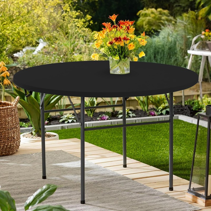 - Multi-Size Stretchy Black Spandex Fitted Table Covers: 90% polyester and 10% spandex, this wrinkle-free and stretchable fabric is also durable, elastic, and stain-resistant. Each set includes 4 pieces, each precisely sized to fit round folding tables ranging in diameter from 44''- 52'' (ideally 48'' inches), ensuring a snug and perfect fit.