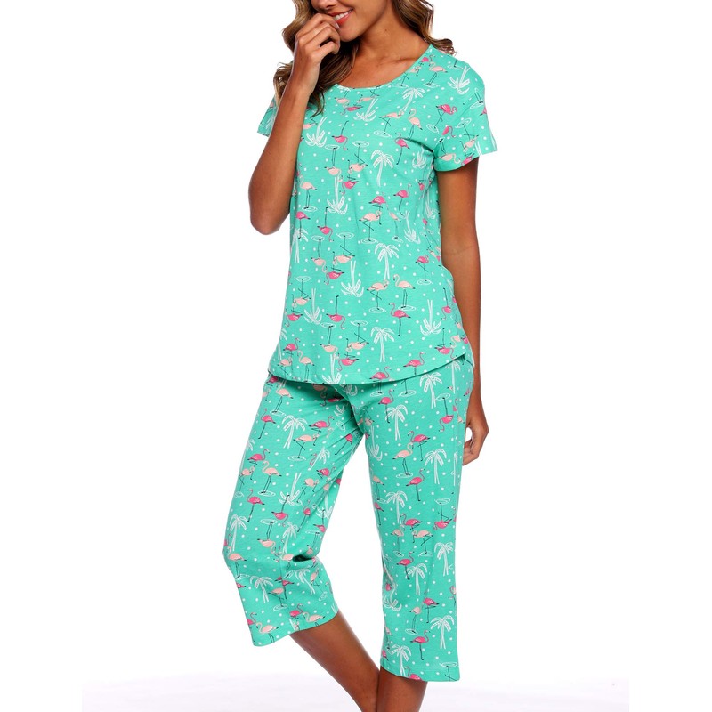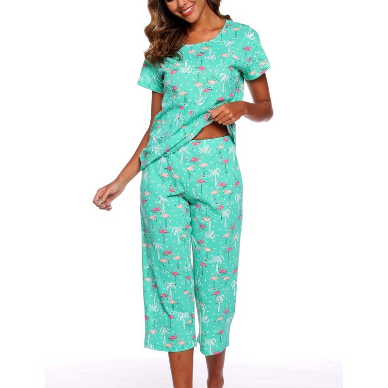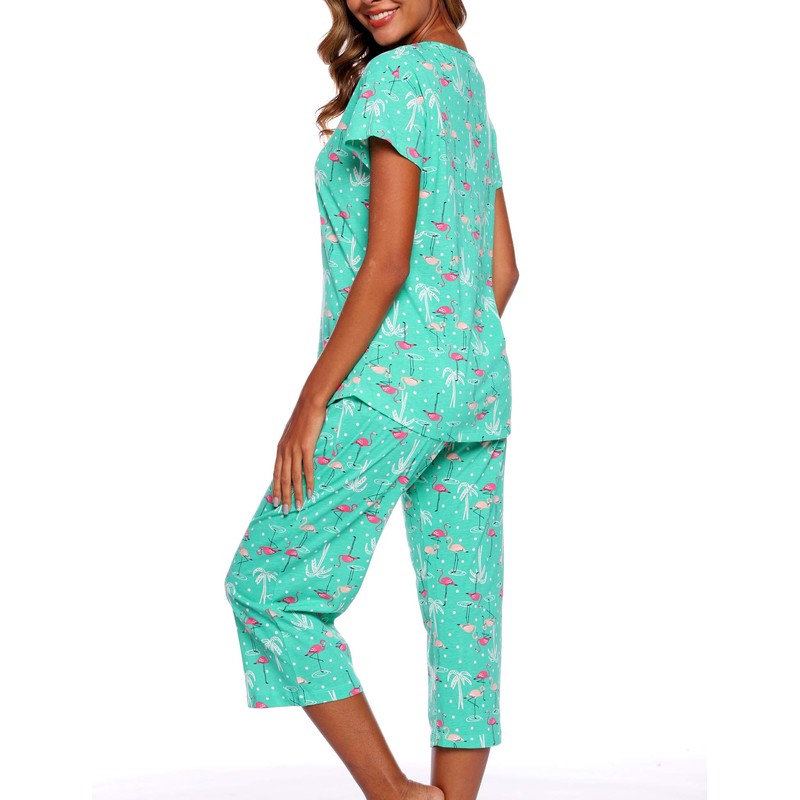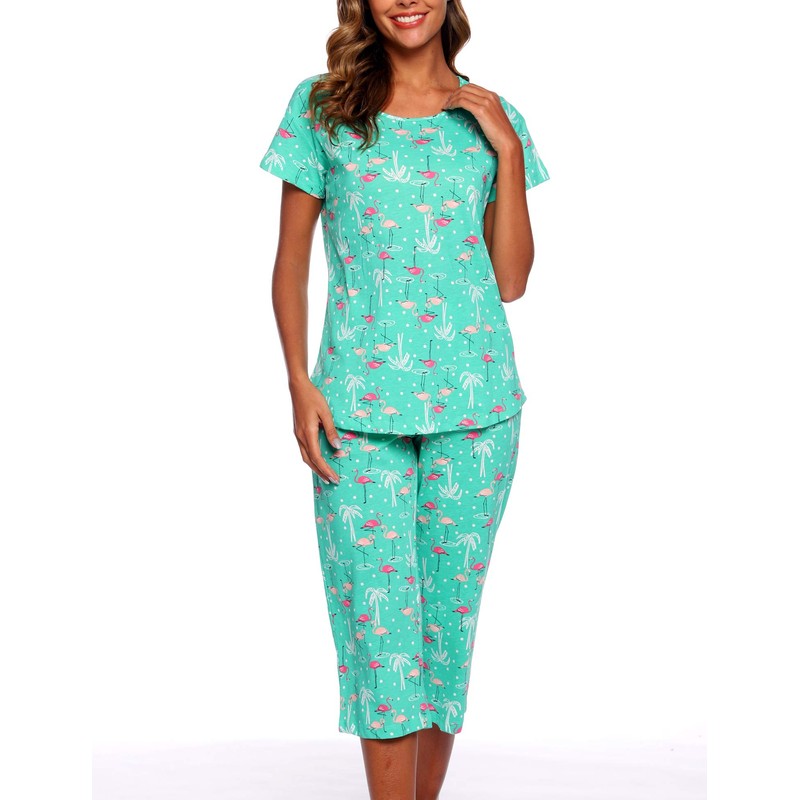 ENJOYNIGHT Women's Cotton Pajamas Set Short Sleeve Top with Capri Pants Sleepwear Set (3X-Large, G.Flamingo)