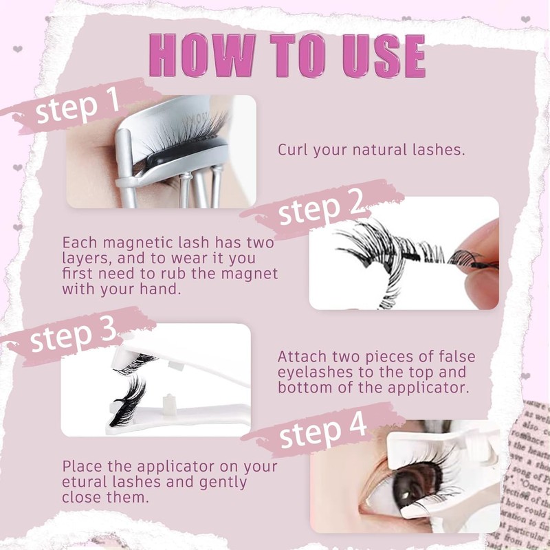 - Friendly for Beginners: Our magnetic lashes kit includes a magnetic applicator and clear instructions—just follow the steps! Take out the lashes, gently separate them from the ends, locate the small magnets on the lash bands, position the applicator clip above your natural lashes near the roots, press to close, and let the magnets secure the upper and lower lash pieces together. Done in seconds!