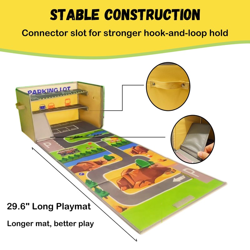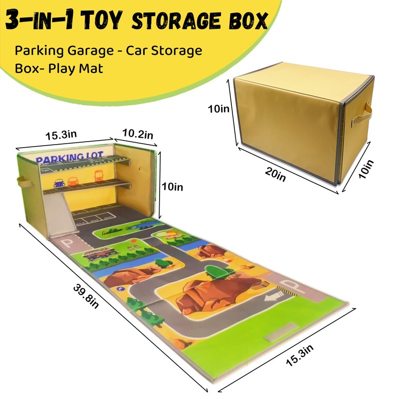 - 🧲 3-in-1 Toy Storage Box, Playmat & Parking Garage This foldable toy car storage box isn’t just for organizing—unfold the lid to reveal a 30" × 15" rock desert oasis-themed playmat, complete with rocks, rivers, roads, gas stations, houses, and more! It’s a toy storage bin, pretend play zone, and multi-level parking garage all in one, keeping people engaged and clutter under control. Fits 3–4 people for shared fun.