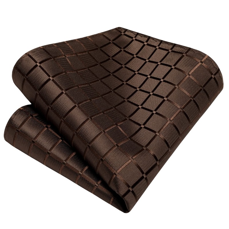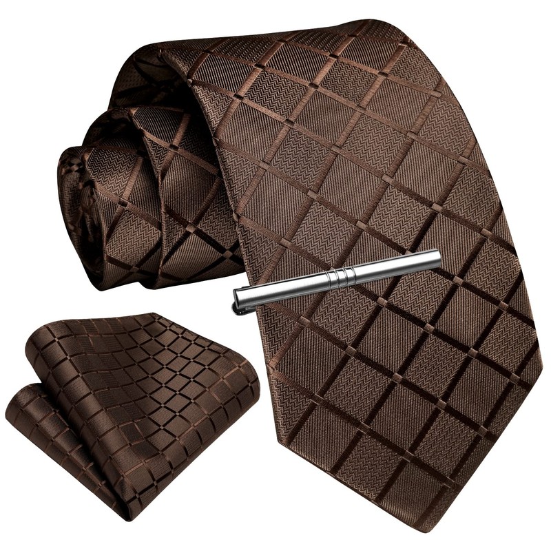 - Brown checked tie set: tie + pocket square + tie clip, a combination that makes you look decent and elegant in daily life. A tie clip for your tie is a key factor if you want to dress preppy and be a gentleman in a suit