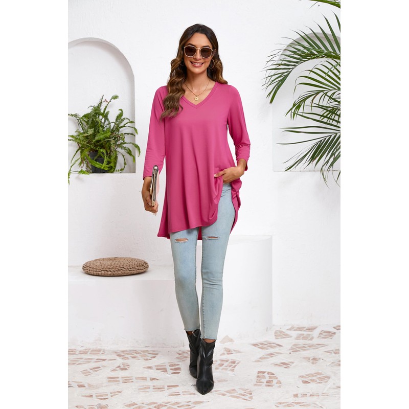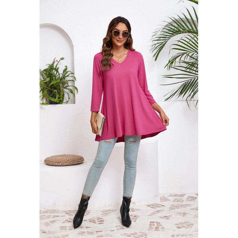 ENMAIN Womens Tunic Plus Size 3/4 Sleeve Tops to Wear with Leggings Loose Fit Dressy Blouse Casual Flowy Swing Round Neck Long Shirts Hot Pink