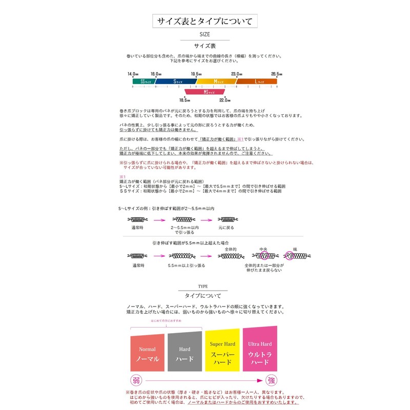 The claw block is a product that has been developed as a nail correction tool that uses industrial springs that have absolute reliability. This product is equipped with a hook on both ends of the corrector to attach to either side of the nail, and the corrector acts as a floating hook on both sides of the nail, so you can do it at home with an orthodic method similar to the hospital or foot salon. In order to accommodate a variety of nails, we have prepared 20 different types of products, including 5 sizes of SS, S, S, M, L, correction strength = normal, hard, super hard, and ultra-hard, so you can choose the right one for your nails. In addition, there may be individual differences, but with this product, you can expect immediate effect by bathing your nails (foot or half bath) and softening your nails with this product. Claw Claw Block Corrector Single Item, Large Ultra Hard Type Color: Pink Gold; Contents: Large Size Corrector (Ultra Hard) x 2, Instruction Manual x 1, Medical Device Certificate x 1.