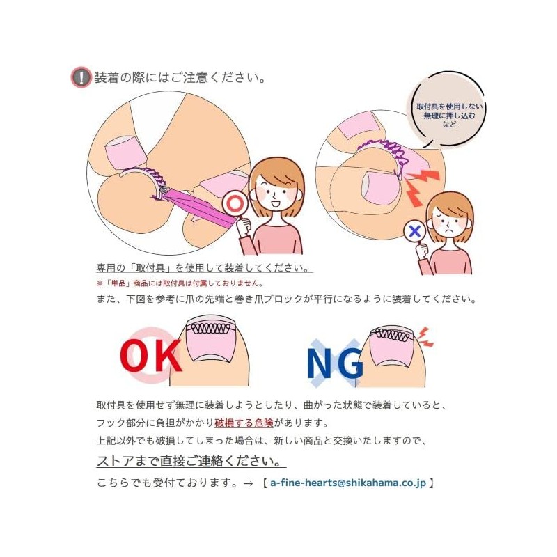 - When considering your first purchase or size selection, please measure the length of the curve from the end of your nail including the rolled part. Since we offer a free measuring seal that can be attached to your nails, please contact a-fine-hearts@shikahama.co.jp to "wish for a measuring sticker". Patented, Third Type Medical Device Approved, Registration Number: 13B3X1015700015