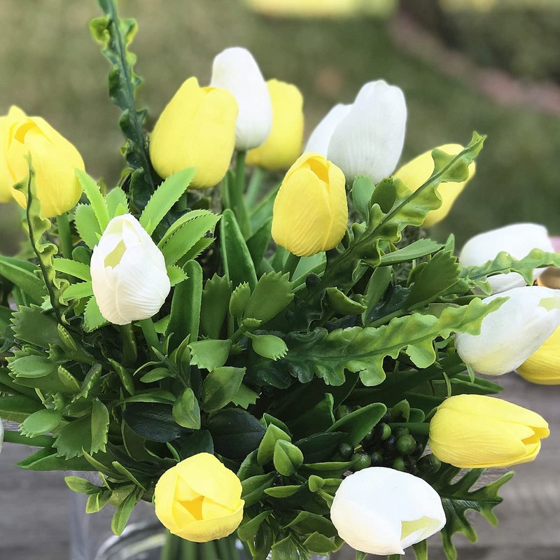 Package Included: 20 Heads faux white yellow tulips with fake plants in glass vase with faux water