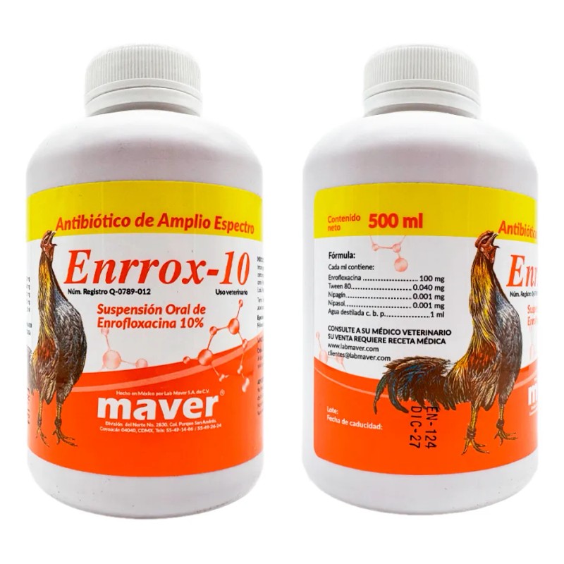 ENRROX-10 de 500ml es un antibiótico de amplio espectro utilizado para el tratamiento de infecciones bacterianas. Tanto contra microorganismos GRAM POSITIVO, GRAM NEGATIVOS, tales como MYCOPLASMAS, BORDETELLA, SALMONELLA, HEMOPHYLLUA, E.COLI, PASTEURELLA Y SRAPHYLOCOCCUS.