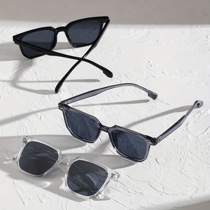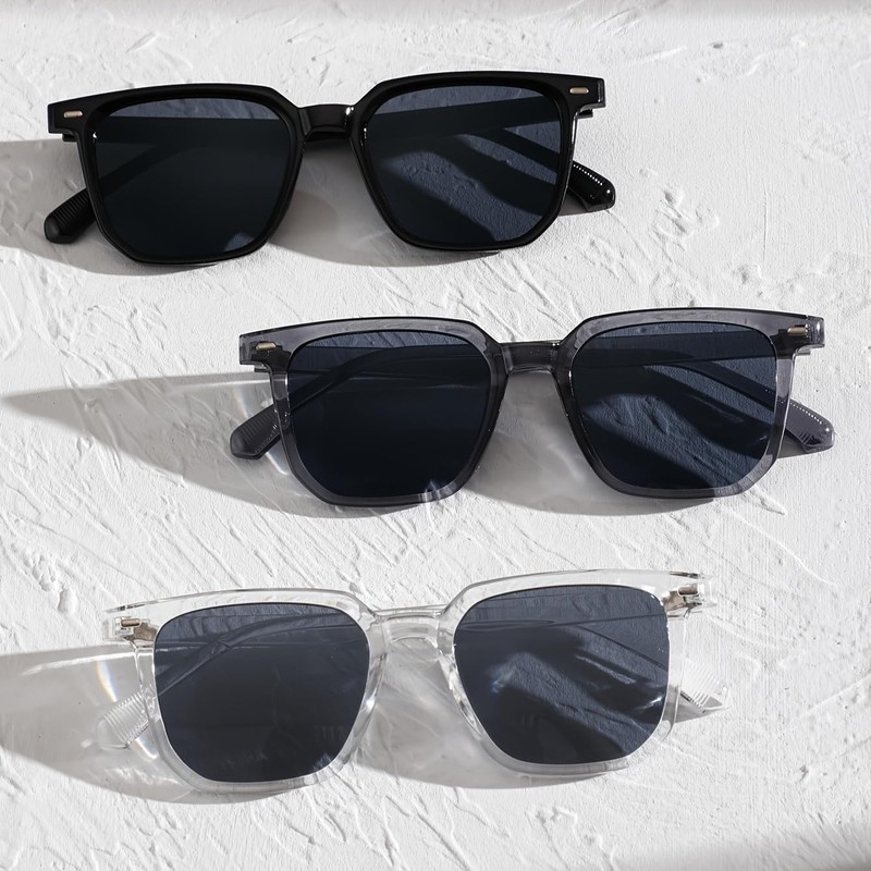 This small-quantity wholesale set contains 40 square sunglasses in 3 frame variations (20 black, 10 gray transparent, 10 clear transparent) - ideal for boutique resellers.