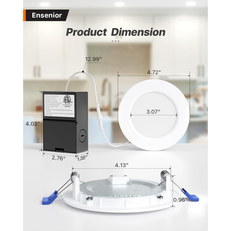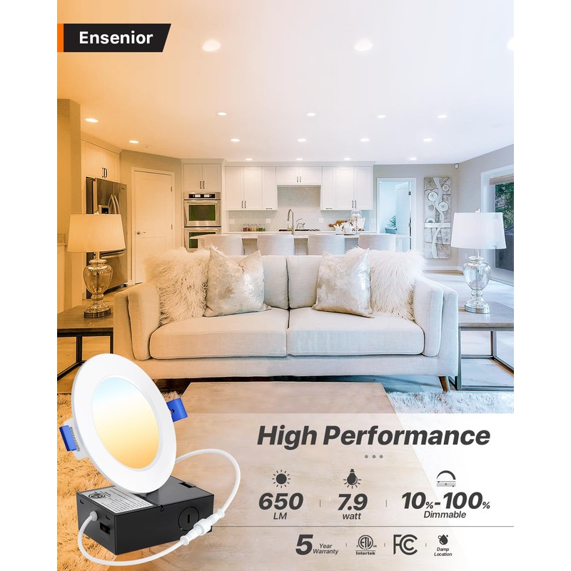 - ✅【IC Rated】Ensenior's recessed light is IC rated, ETL & FCC certified, and features UL-certified wire terminals. Engineered for safety, the junction box requires only a 2-inch ceiling space and provides thermal protection and insulation compatibility.