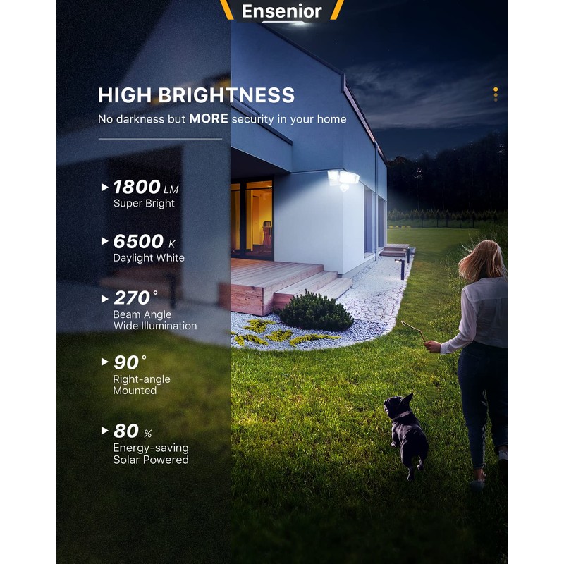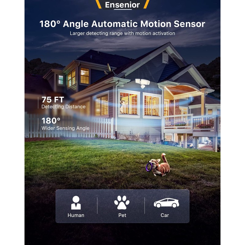 •  [Wide Angle & Motion Sensor] Ensenior security flood light has adjustable 3 heads and a large 270 beam angle, illuminating a wider area with right-angle installation. The 180 sensor detects movement up to 75FT, providing extra security for your home.