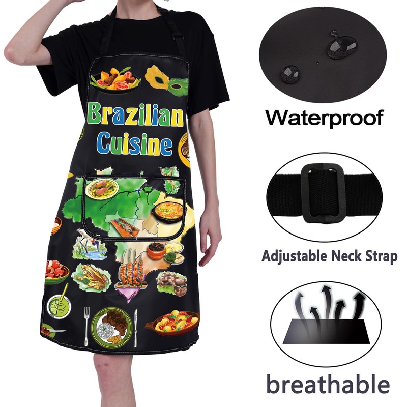 - Brazil apron waterproof Brazilian Food print aprons - 2 Practical Pockets Brazil Kitchen Apron can keep your utensils, recipes, phone, or any other cooking tools. Whether cooking, barbecuing, or painting, can wear this apron, which is both good-looking and very practical.