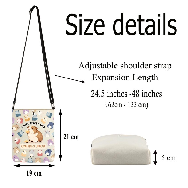 - SIZE: This guinea pig crossbody purse measures 8.5”*6.7”*1.8”. The small shoulder handbags for women are ideal for carrying small items such as mobile phones, bank cards, keys, etc. when you are out and about. With an adjustable shoulder strap, the purse can be worn as a crossbody bag or a shoulder bag
