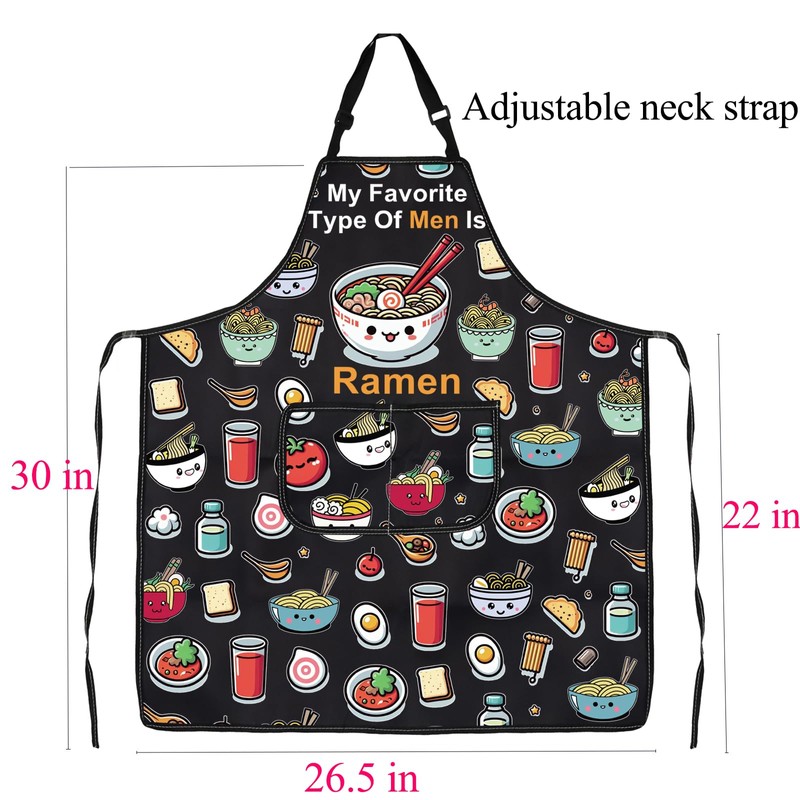- ONE SIZE FITS MOST: The Ramen apron is 28.7 inches (73 cm) in length and about 26.7 inches (68 cm) in width. It can cover adults from the chest to the knee and provides great coverage. A long waist strap and an adjustable neck strap fit most people