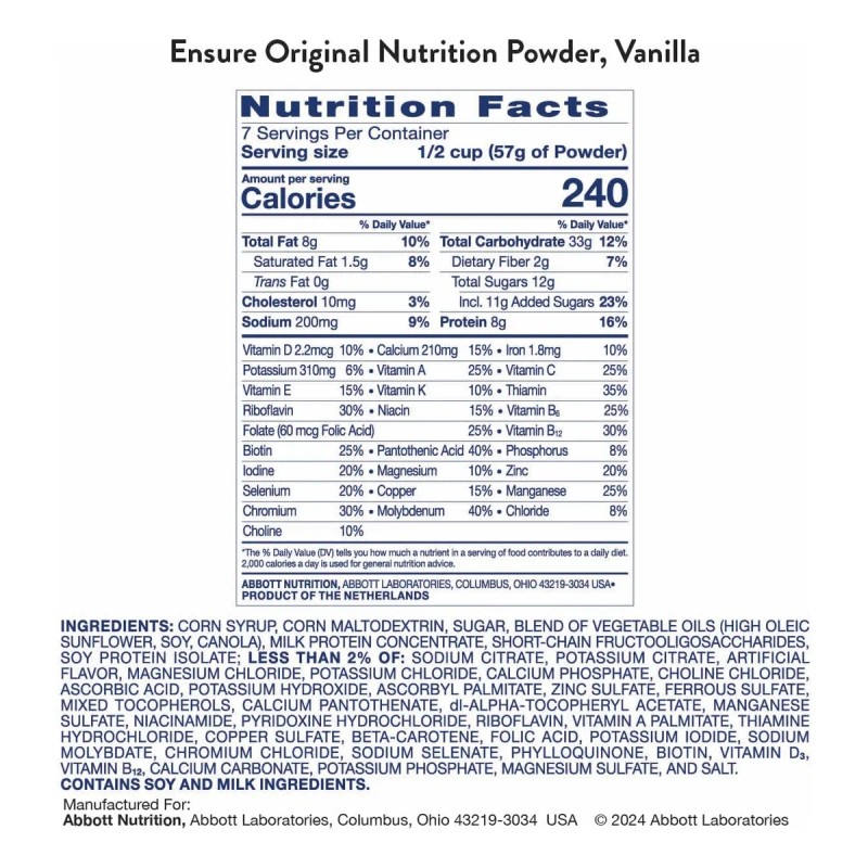 - COMPLETE NUTRITION: Each serving of Ensure Original Powder has 240 calories and 8 grams of protein, to provide you with complete nutrition at just over $1 per serving