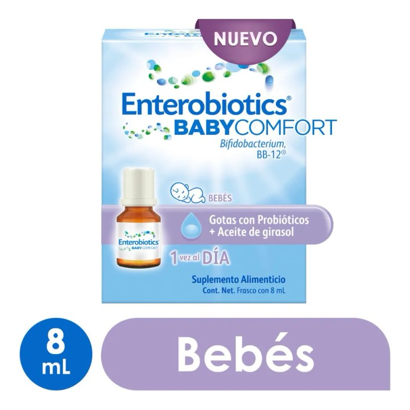 Calma el llanto por cólicos de tu bebé con Enterobiotics Baby Comfort Suplemento Alimenticio en gotas. Su fórmula contiene aceite de girasol y probióticos BB-12 de origen natural, sin saborizantes, sin gluten y sin lactosa. Confía Enterobiotics, de los expertos en probióticos.