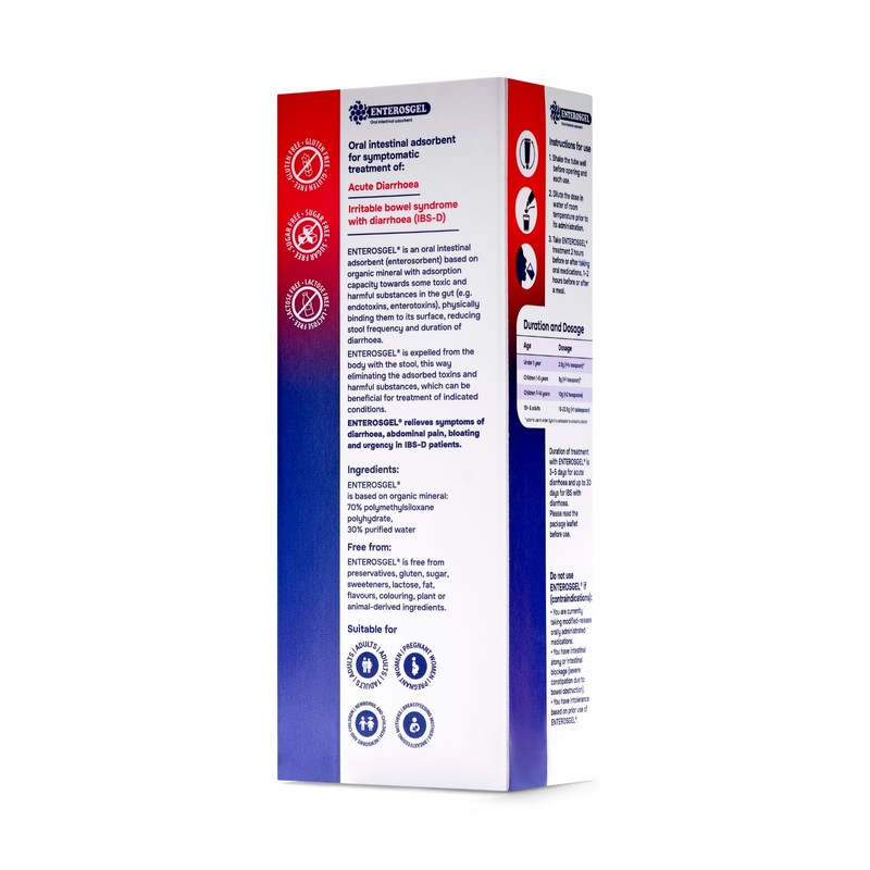 - FREE FROM: ENTEROSGEL is free from sugar, lactose, gluten, preservatives, has no taste or colour, vegan friendly and completely non-allergenic.