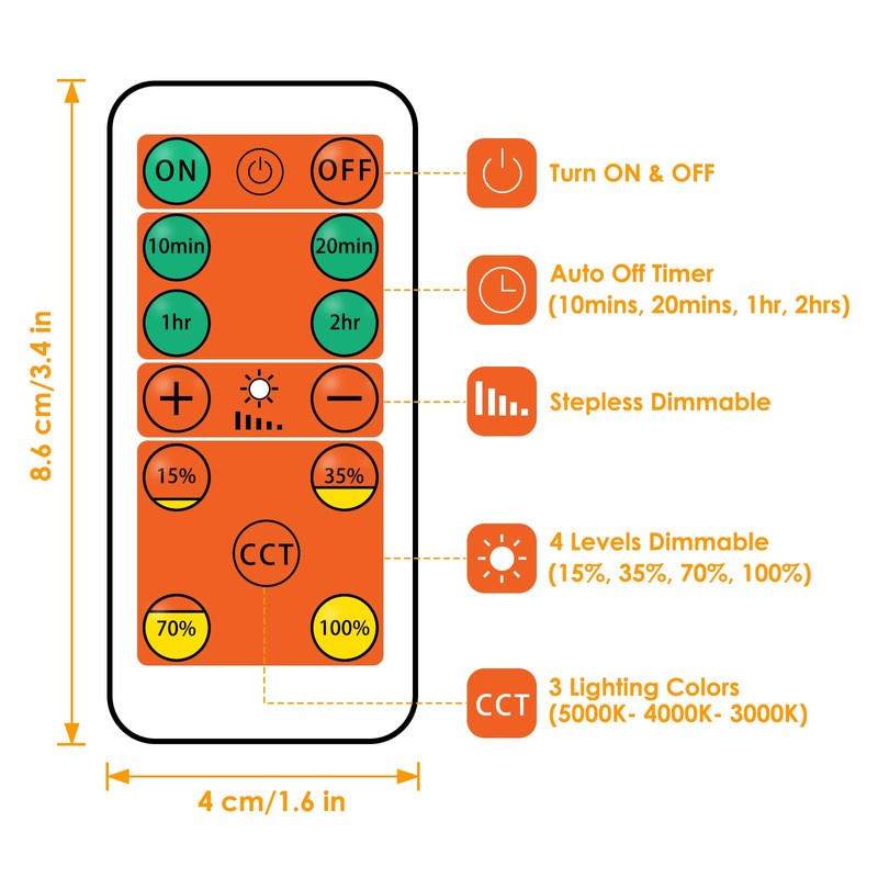 - Multifunctional remote control: the touch switch on the square lamp base only turns the lamp on and off. The wireless remote control can achieve more functions, including switching on and off, 4-level timer functions, infinitely dimmable and 4 levels dimmable (10% - 40% - 80% - 100% brightness)