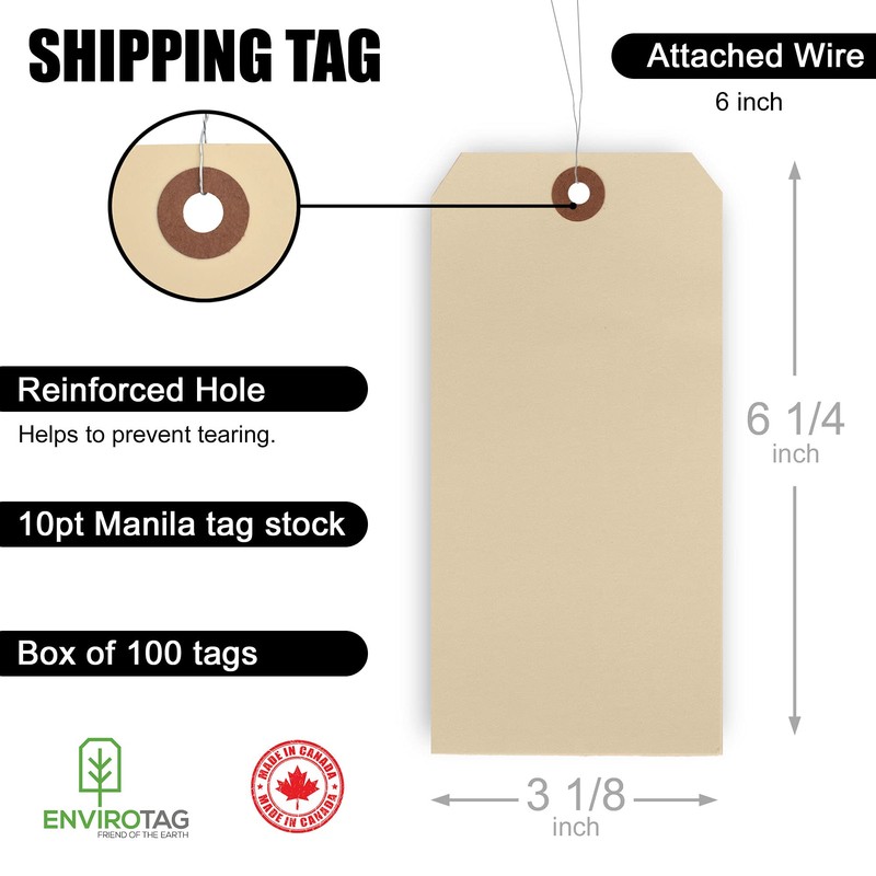 EnviroTag Manila Shipping Tags, Size 8 (6 1/4'' X 3 1/8''), 100 pcs, Prewired with 6" Galvanized Wires