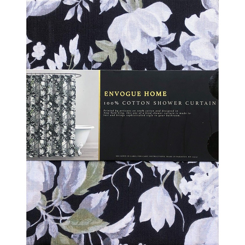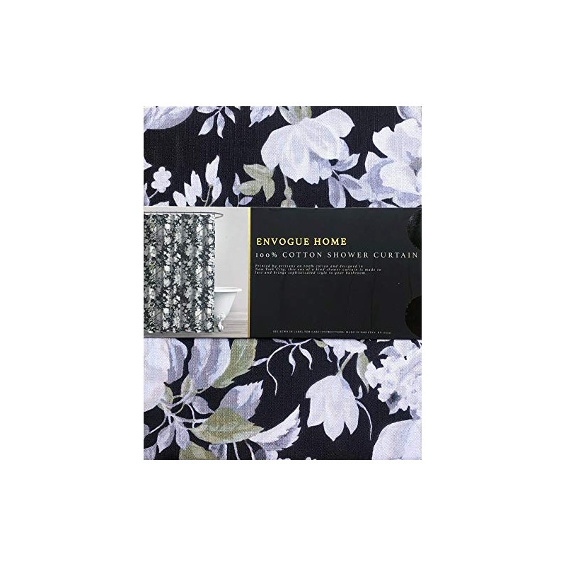 Envogue Designer Shower Curtain Floral Pattern in Shades of Gray Green White on a Black Background 100% Cotton Luxury