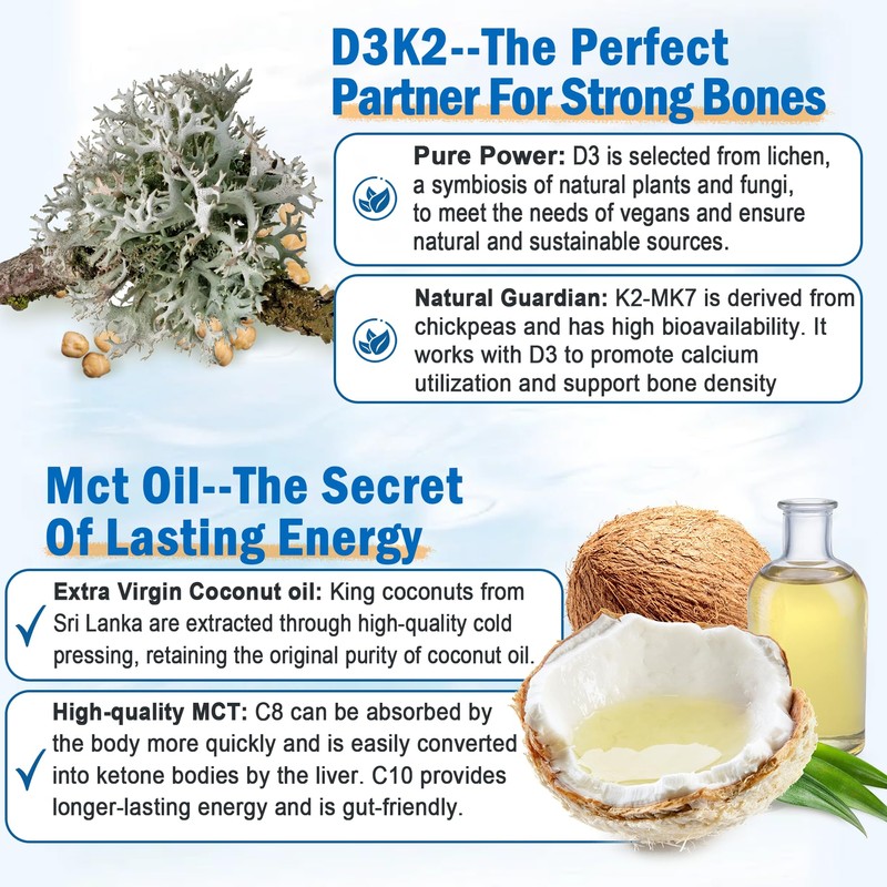 • Natural Combination, Added Benefits - Each serving omega 3 delivers 600 mg of EPA and 400 mg of DHA sourced sustainably from Marine Algae. Omega 3 supplements provide a high-quality source of EPA and DHA, the two essential omega-3 fatty acids, in bioavailable forms that are easily utilized by the body. EPA and DHA are essential for optimal brain function, cognitive performance, and sharper eye function. Vitamin D3+ K2 support healthy immune system and bone health in your daily activities. Thats a whole lot of goodness