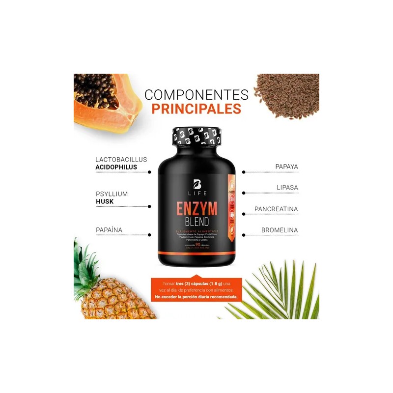 Alcanza tu balance interno con Enzym Blend B Life. Nuestra increíble concentración de 600 mg de una mezcla a base de Papaya, Lactobacillus acidophilus, Psyllium Husk, Papaína, Bromelina, Pancreatina y Lipasa, es una composición valiosa para tu bienestar, en comparación con otras formulaciones que proporcionan solo 400 mg. Contiene 90 cápsulas.