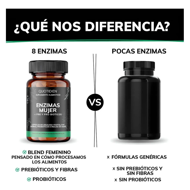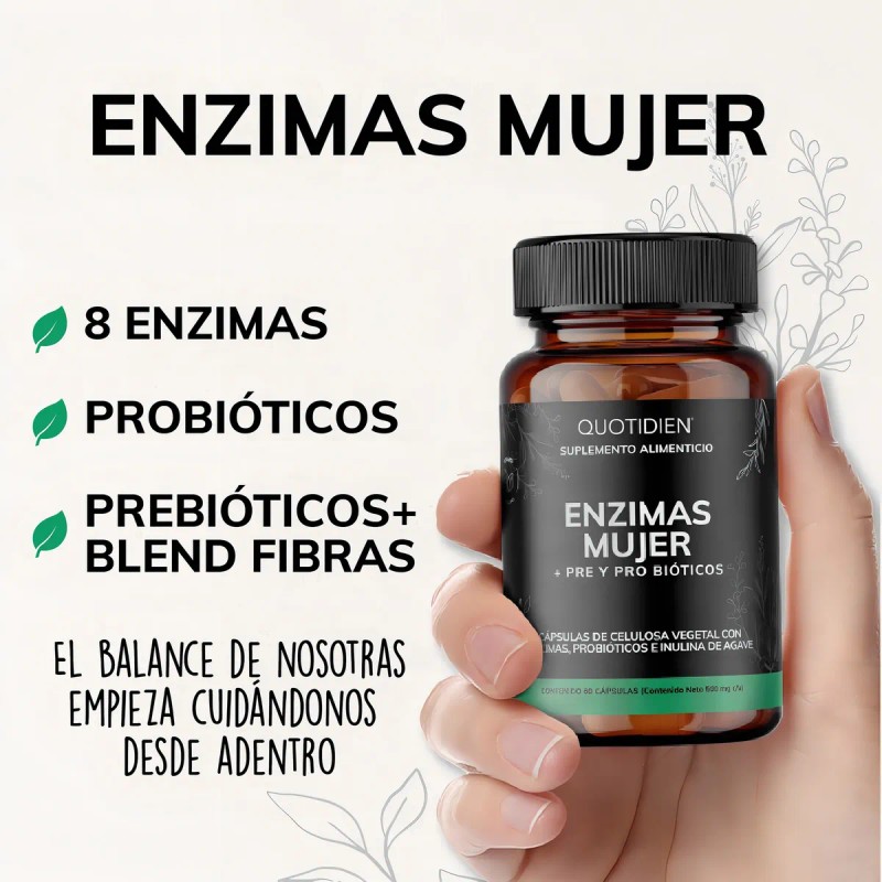 Descubre las enzimas digestivas super completas de Calidad Quotidien, el secreto mejor guardado para una digestión impecable y un bienestar incomparable. Nuestra fórmula avanzada incluye 8 enzimas poderosas, 2 probióticos efectivos y 2 prebióticos nutritivos (fibras). Hemos creado una combinación imbatible diseñada específicamente para ti.